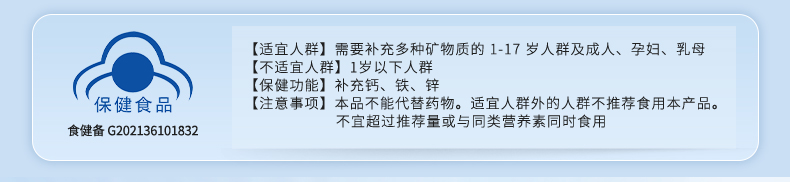適宜人群:需要補充多種礦物質的1-17歲人群及成人、孕婦、乳母