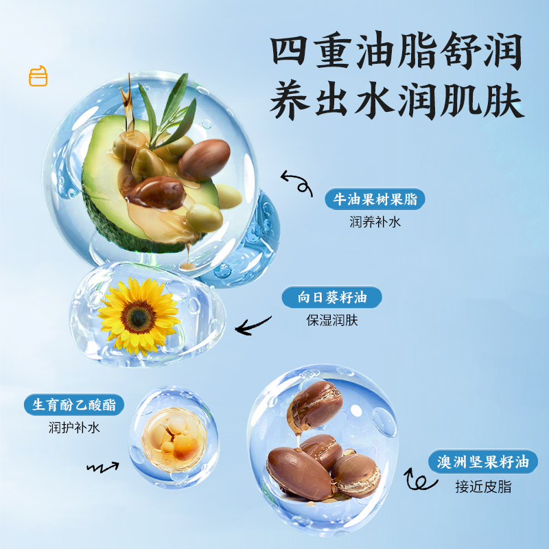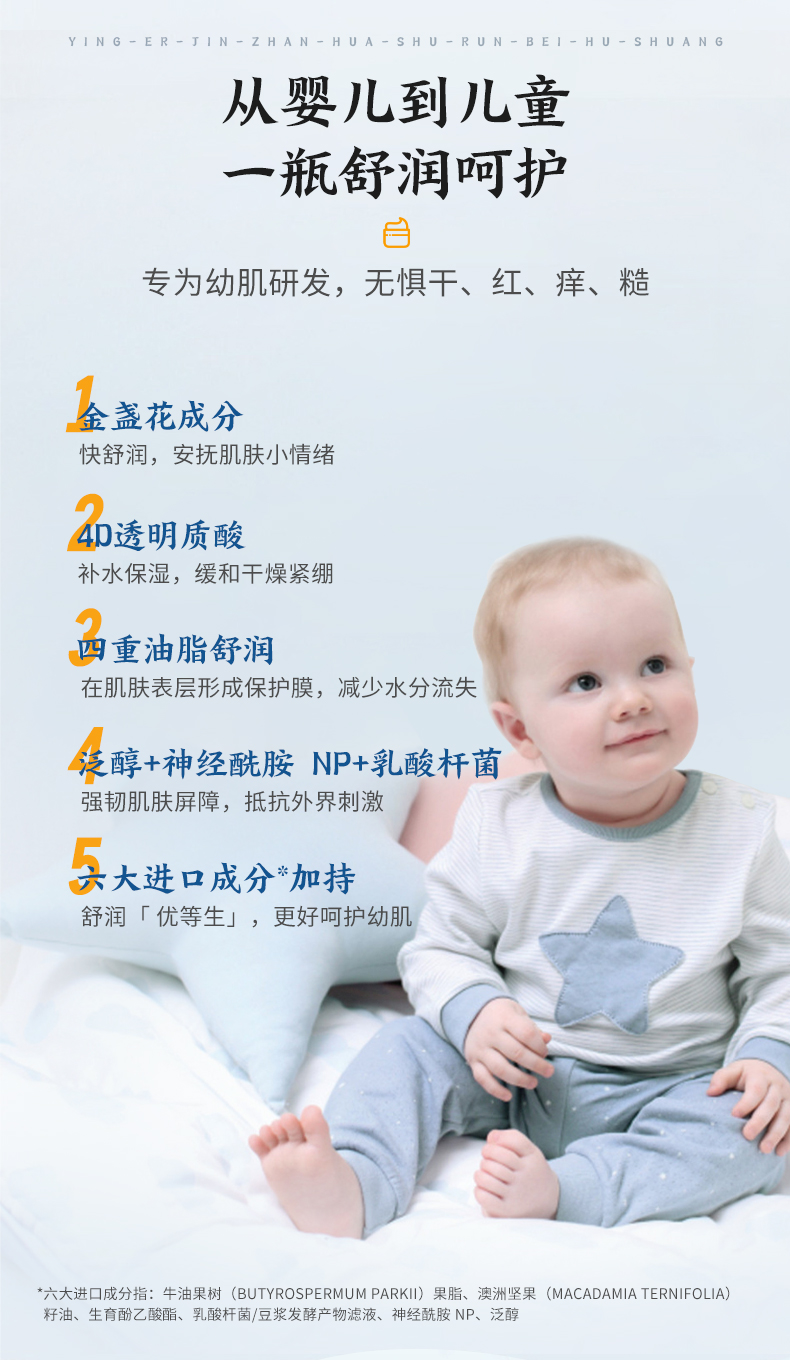 功效:甄選泛醇、金盞花花提取物等多種成分,細(xì)膩盈潤(rùn),一抹即開(kāi)保濕肌膚,呵護(hù)寶寶柔嫩肌膚。