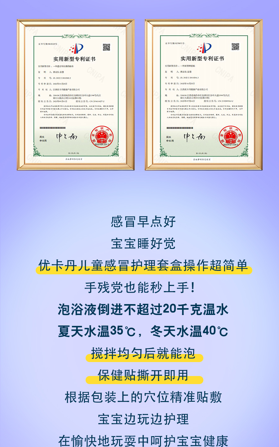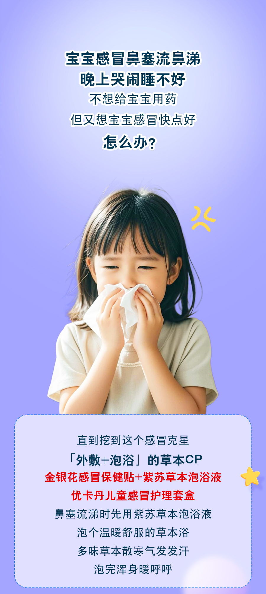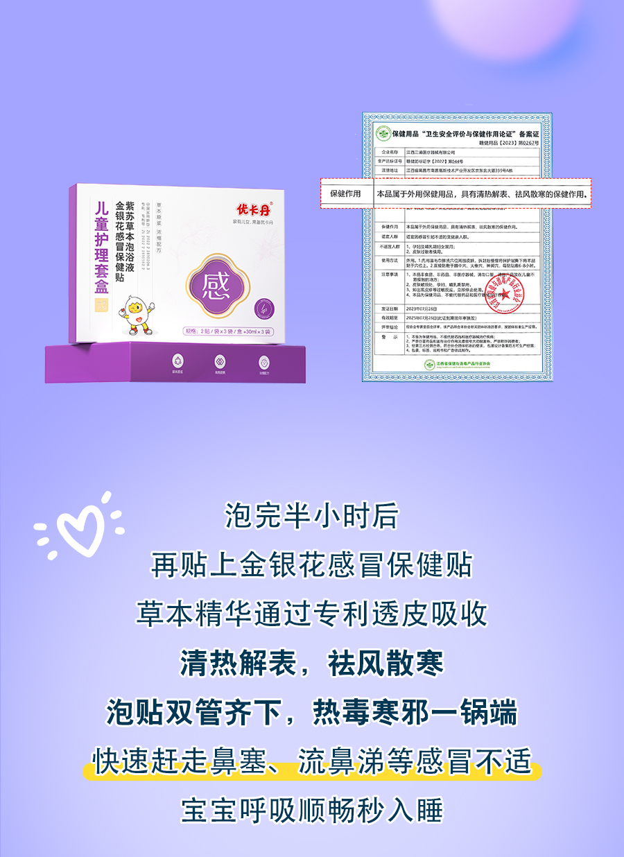 【產(chǎn)品名稱】優(yōu)卡丹兒童草本感冒護(hù)理套盒(金銀花感冒保健貼、紫蘇草本泡浴液)